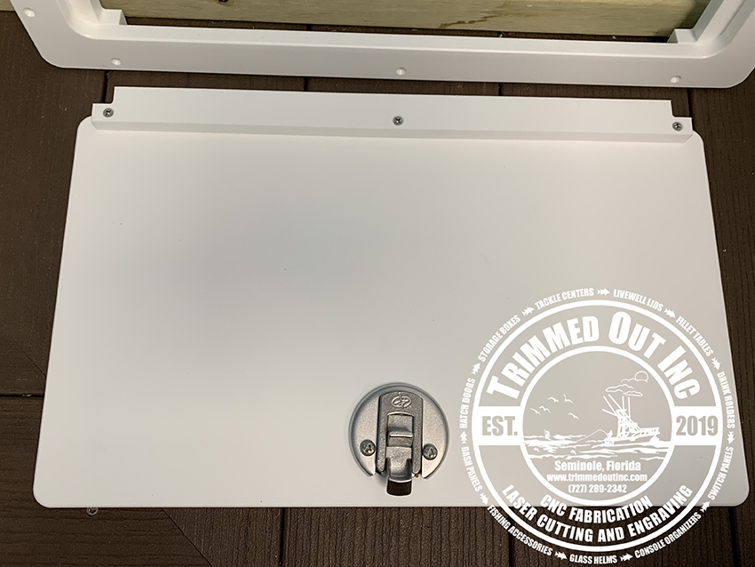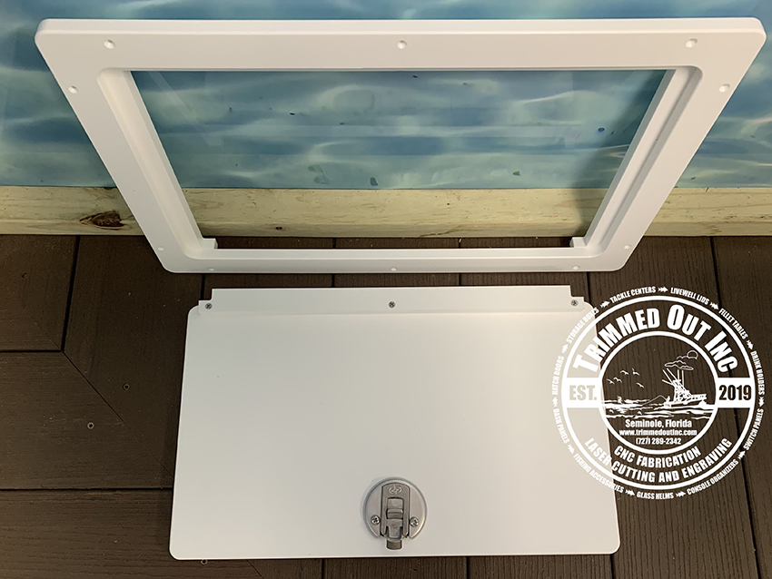 Introducing the Lift Out Hatch Door, your new go-to solution for optimizing space and enhancing accessibility! Imagine having a practical, durable door that fits seamlessly into your boat, making tricky access points no longer a hassle. This Lift Out Hatch Door 11″H x 18″W is built with King Starboard precision cut on our CNC machine. However, our competitors may use a FRP Hatch (Fiberglass Reinforced Plastic), which fades, becomes chalky and gives off the fiberglass powder which makes you itchy. Therefore, this is why we only make hatch doors with King Starboard. The lift out feature of this hatch door allows for quick access or to use as service hatch for electronics.